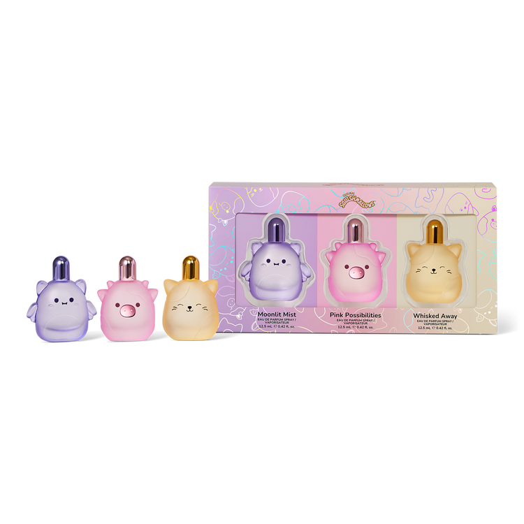Tres aromas. ¡Tres maneras de alegrar los momentos cotidianos! Combínalos para crear tu aroma característico. ¡El mini set de lujo de Squishmallows Fragrances te ofrece alegría en cada rociado!