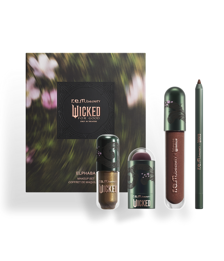 El set de maquillaje r.e.m. beauty x Wicked: For Good Elphaba te ofrece todo lo necesario para crear un look facial completo inspirado en su mágica y poderosa presencia. La sombra de ojos líquida, en un atractivo verde bosque con tonos marrón y champán perlado, cubre los párpados con un color brillante. Aplica el rubor y el labial para un toque translúcido de color ciruela luminoso que hidrata la piel. Completa el look con un delineador de labios marrón chocolate intenso para definir los labios y remata con una capa brillante de bálsamo brillante marrón cálido con un fascinante toque ciruela. Crea un look atrevido y audaz o un toque translúcido de color para todos los días.